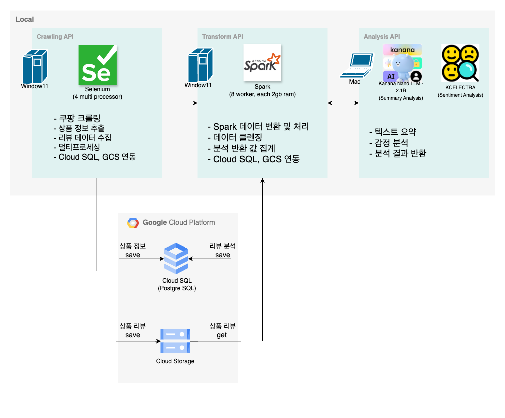 데이터 추출 후 상품 정보 -> Cloud SQL에 저장되며, 상품 리뷰는 GCS에 저장됩니다. 그리고 분석된 리뷰 결과는 Cloud SQL로 저장됩니다. 해당 저장방식은 '웹 서비스를 위한 데이터는 바로 Cloud SQL에 저장하면 되지 않을까?' 라는 단순한 생각에서 비롯됐습니다.