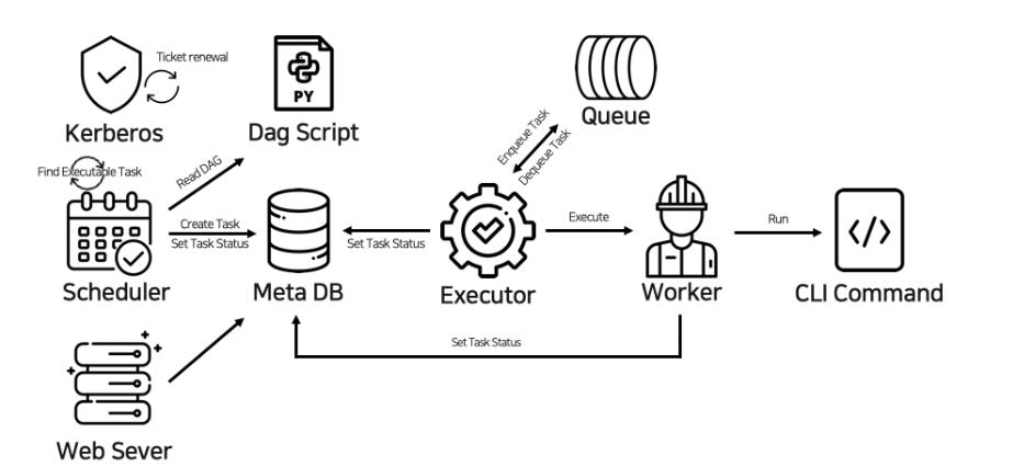 - Worker: Queue에서 Task를 가져와서(Dequeue Task), 실제 명령(Run CLI Command)을 실행하는 주체입니다. 작업이 완료되면 Task의 최종 상태를 Meta DB에 다시 기록합니다(Set Task Status).