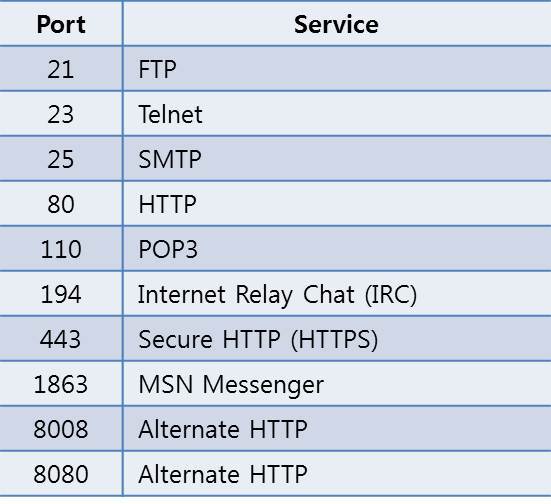 - Well-known ports(0~1,023) : IANA에 의해 배정되고 제어된다.
