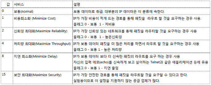 - Type-of-Service Flages (TOS) : 서비스의 우선 순위를 제공