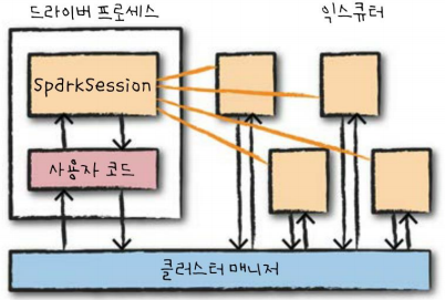 스파크 애플리케이션은 Master-Slave 구조로 실행됩니다. 사용자가 클러스터 매너지에 스파크 애플리케이션을 제출하고, 클러스터 매니저로부터 받은 자원을 이용하여 작업을 처리합니다. 이때, 드라이버와 익스큐터는 단순한 프로세스이므로 같은 머신 또는 다른 머신에서 실행이 가능합니다.