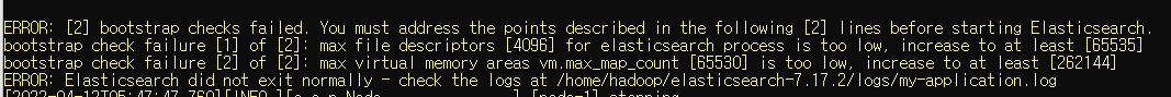 수정 후 elasticsearch시작 시 bootstrap checks failed이 발생했습니다.