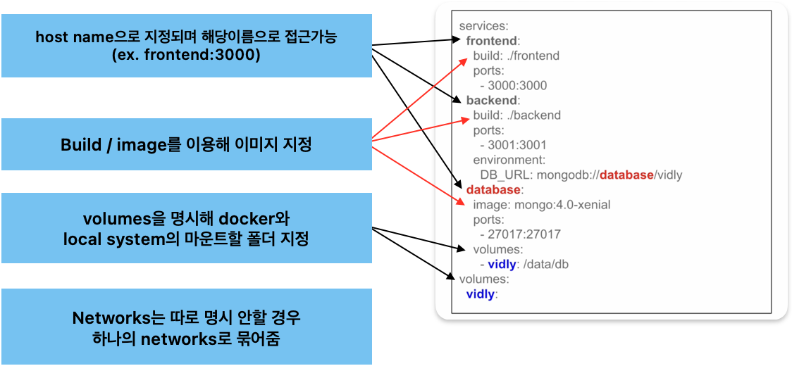 - 즉, 각 서비스는 자신의 Dockerfile을 갖고 있어야함 아니면 Docker hub등에서 이미지를 다운로드