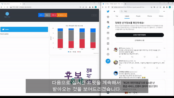 - 주제: 대선관련 실시간 트윗을 키워드 추출 및 감성분석 후 시각화를 하는 웹페이지