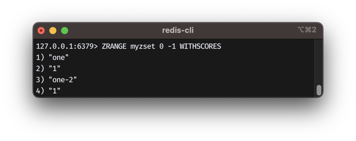ZRANGE myzset 0 -1 WITHSCORES