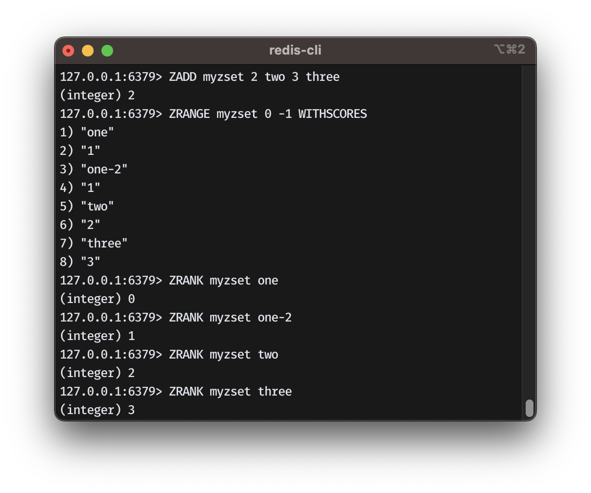 ZADD myzset 1(score) one