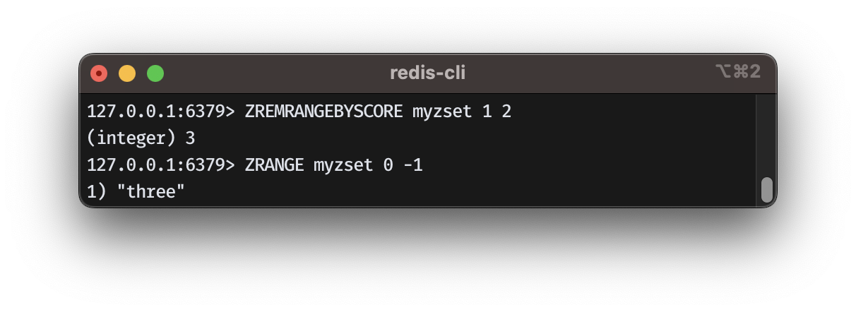 - ZREMRANGEBYSCORE 주어진 key에서 주어진 min, max 이내의 (inclusive) score를 가지는 member를 삭제하고, 삭제된 memeber의 수를 리턴한다.