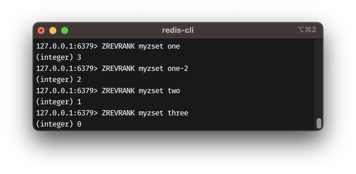 - ZRANK 주어진 member의 rank를 리턴한다. Ranking은 0부터 시작하는 오름차순이다.