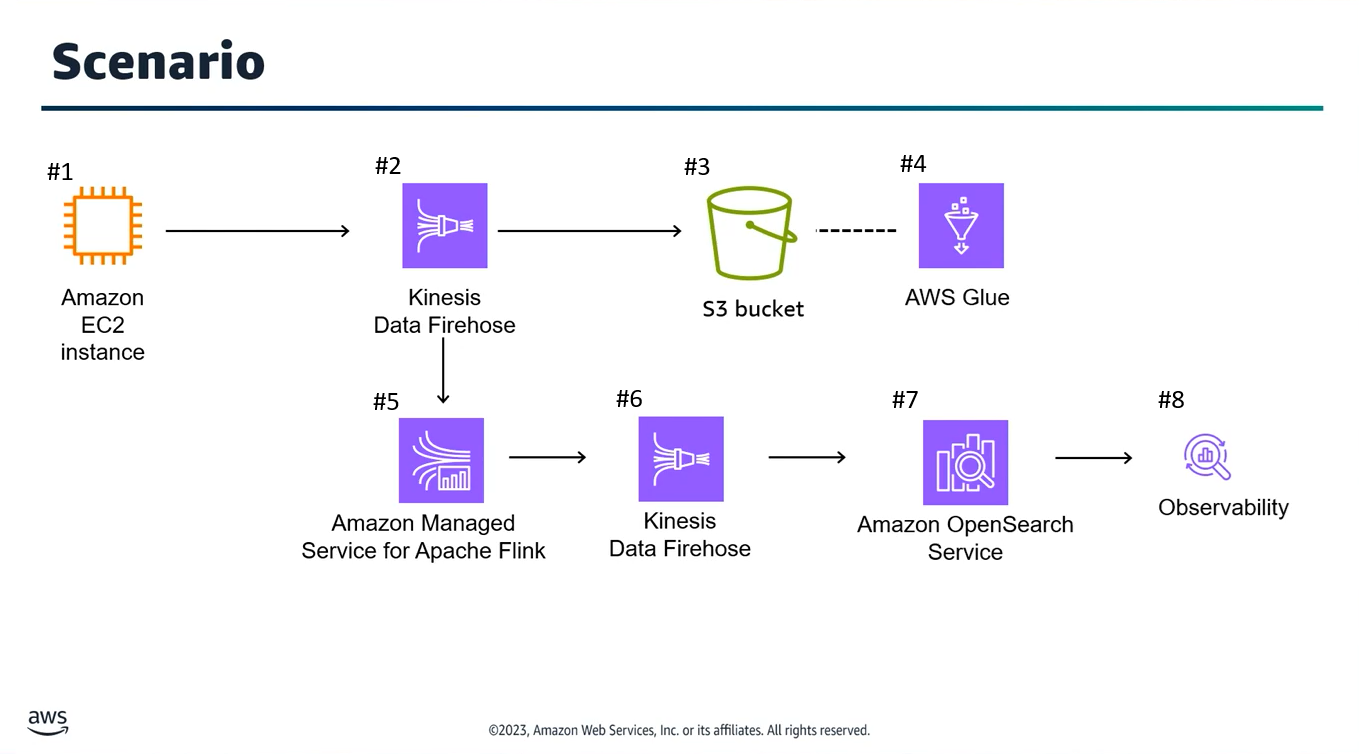 이 아키텍처에서는 Amazon EC2 인스턴스가 Apache 웹 서버를 실행하고 있습니다. 이 솔루션의 목표는 Kibana 대시보드(Observability)를 사용하여 데이터를 시각화하고 사용자에게 제공하는 것입니다.