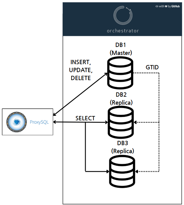 - ProxySQL은 App Server의 SQL 요청을 받고 설정된 DB 경로에 SQL 작업을 하게 합니다.